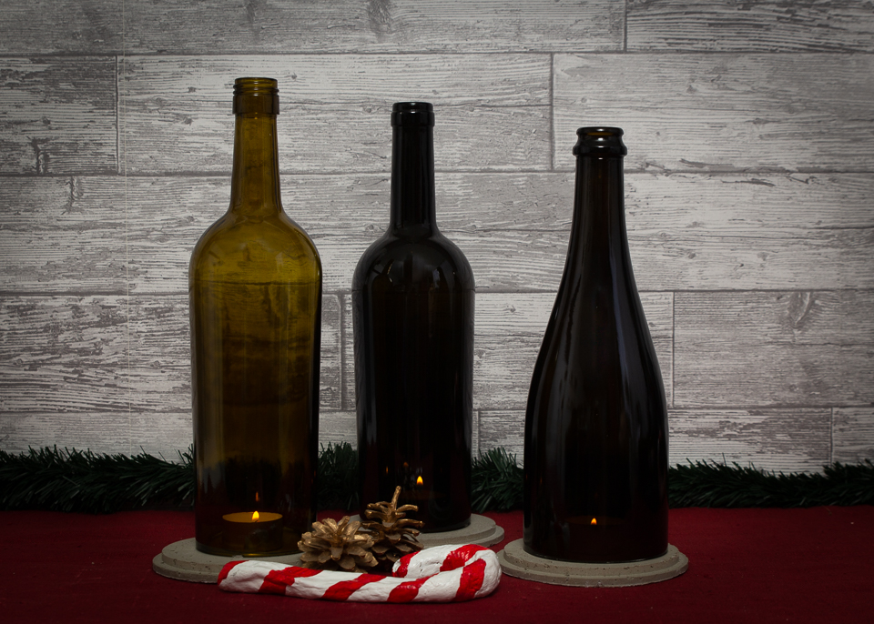 Gällande bild nr. 8 så är det vinflaskor med avskuren botten som står på ett underlag gjutet i ett yoghurtlock, av betong. Vinflaskorna ger supermysigt sken i vintermörkret. (125 kr/st)
